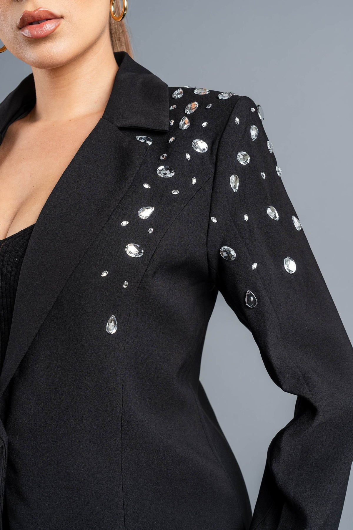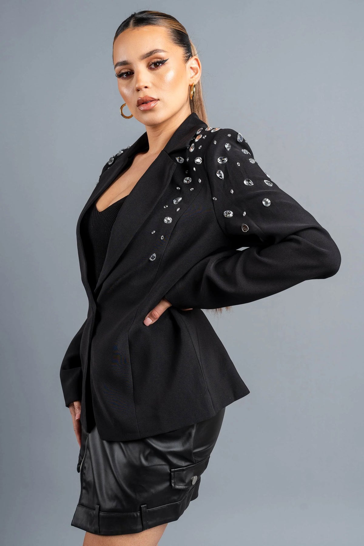 Jacket designed in a structured, thick woven fabric with rhinestone embellishments along the shoulders for a bold yet polished statement. This blazer jacket features a classic lapel neckline, long sleeves, and a tailored silhouette that elevates both casual and dressy looks. The stretch construction offers a comfortable fit while maintaining a sharp, refined shape, making this piece perfect for nights out, special events, or styling over dresses, tops, and sets. Available in Black.
