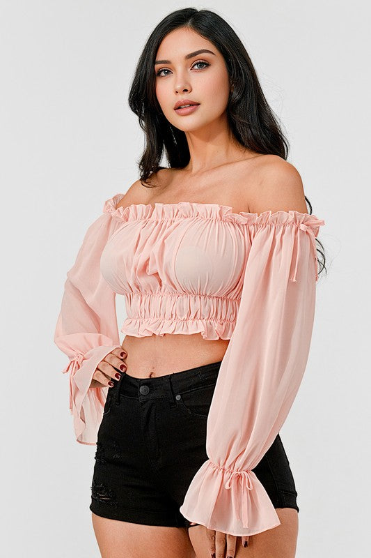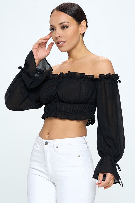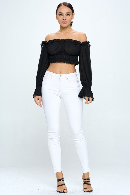 Elevate your wardrobe with this Off Shoulder Ruffle Trim Knot Sleeve Crop Top, crafted from soft, stretchy fabric for a comfortable yet refined fit. Designed to flatter with its ruffled trim and elegant knot sleeves, it fits true to size and requires gentle care—hand wash cold and hang dry to maintain its delicate shape. Perfect for sophisticated, effortless style.
