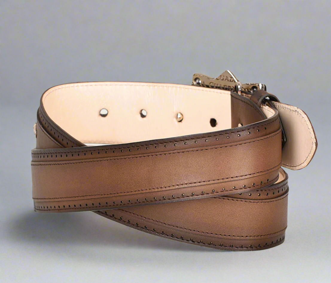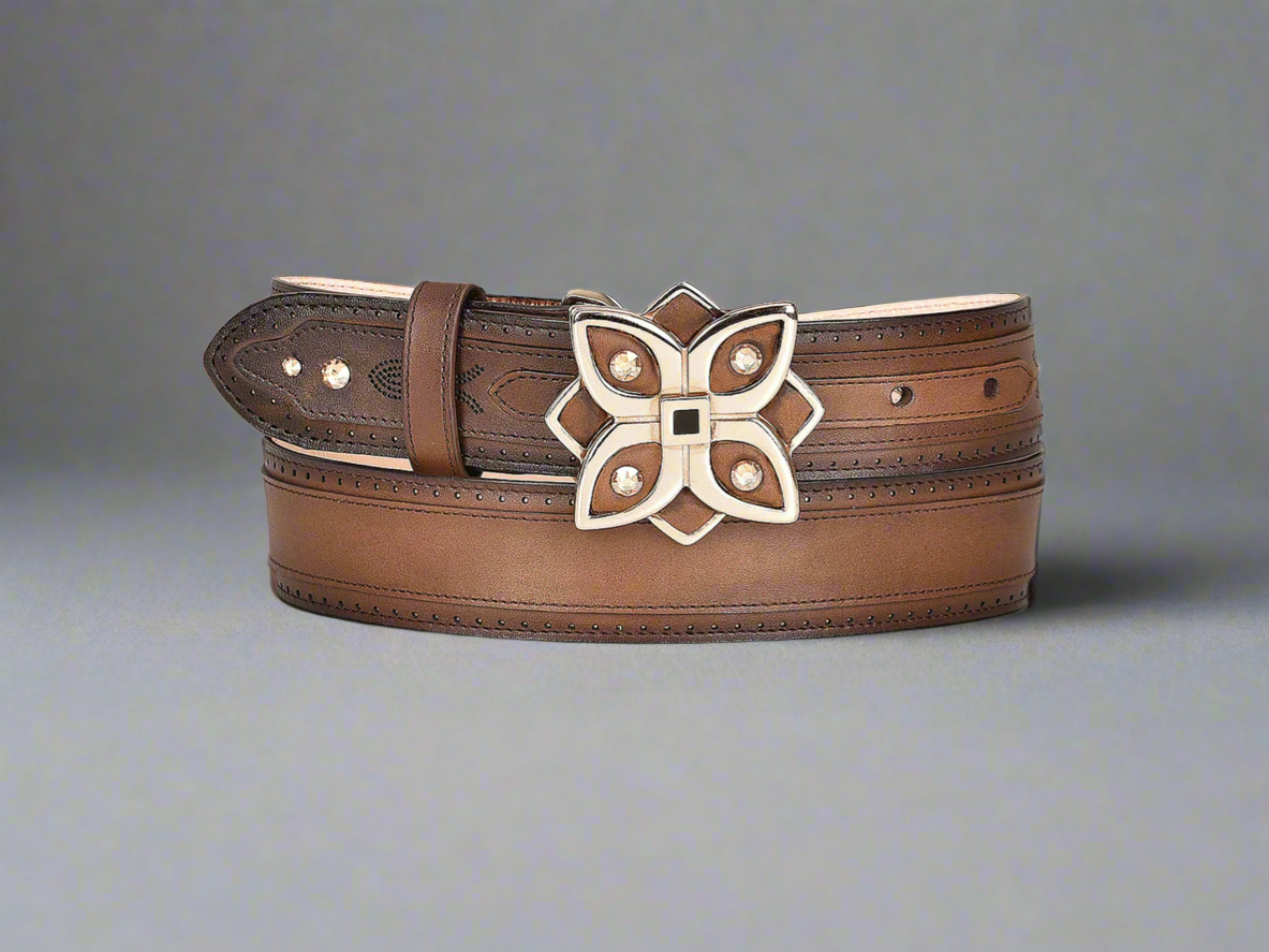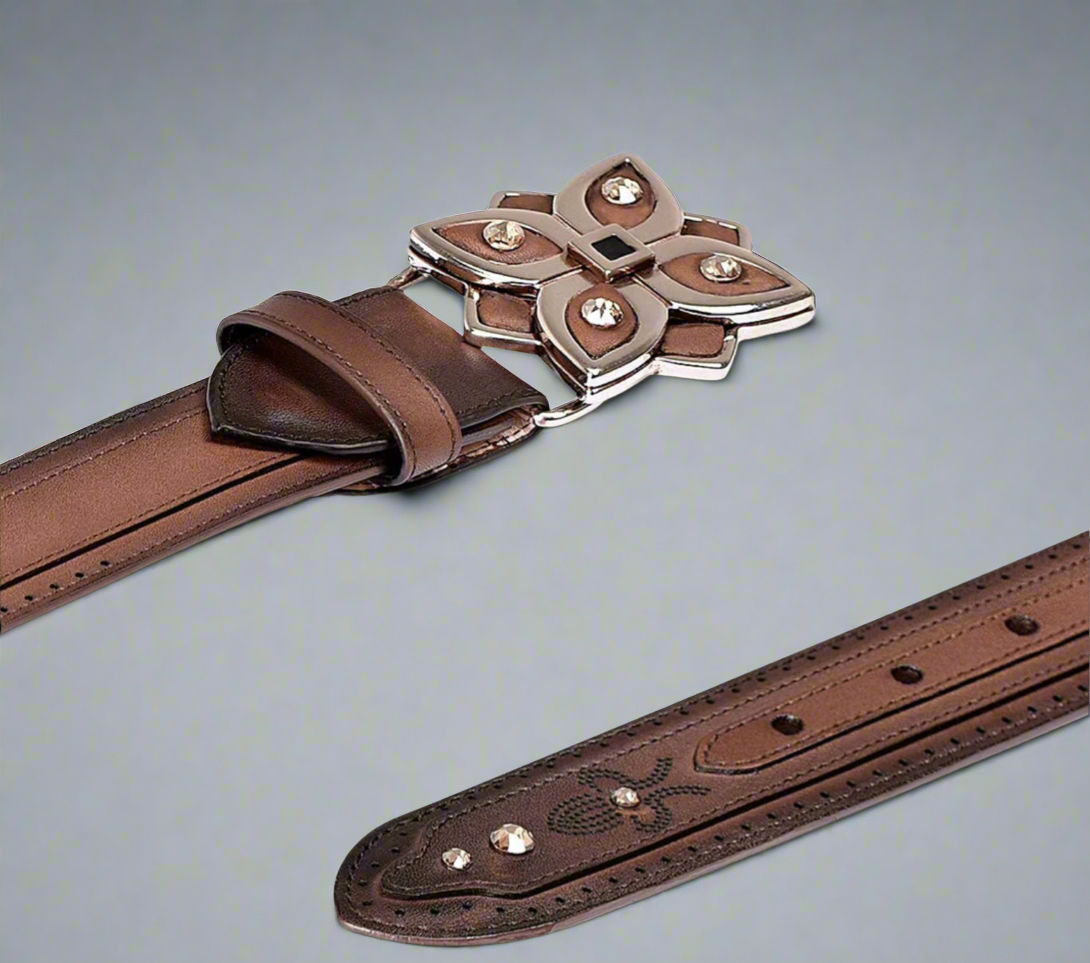 This elegant women's belt crafted from genuine cowhide leather features delicate perforated edges and authentic crystal embellishments, adding a refined sparkle. Its 38 mm metal buckle, shaped like a flower and adorned with crystals, enhances its sophisticated appeal. The cowhide lining bears the Cuadra logo, while natural marks and scars highlight the belt’s unique authenticity and craftsmanship. Perfect for elevating casual outfits with a touch of luxury.