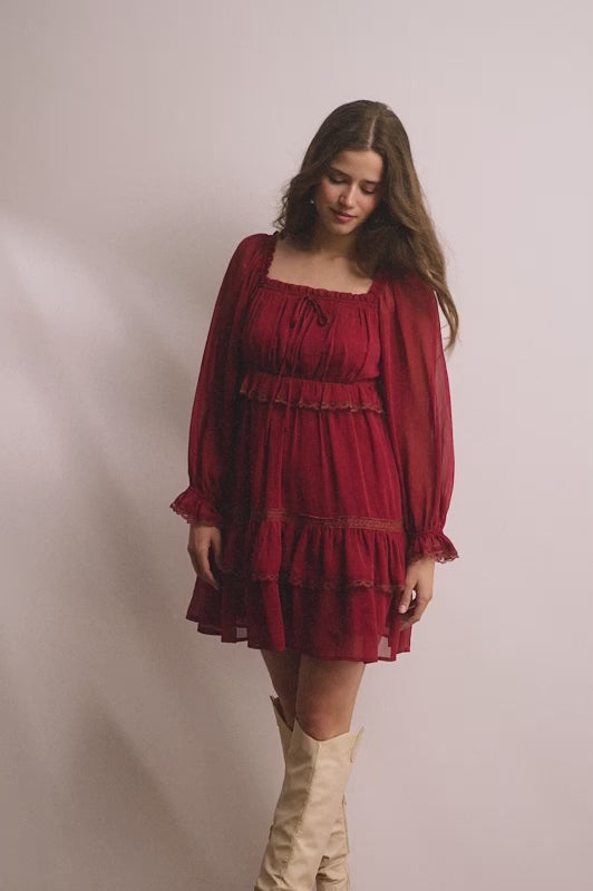 This Crinkled Tiered Boho Mini Dress features a lightweight, breathable fabric with a soft textured finish. Its romantic square neckline is accented with delicate ruffles and a functional tie, while the smocked back panel ensures a comfortable, flattering fit. The tiered skirt with tonal lace trim adds graceful movement, complemented by billowy long sleeves with elastic cuffs and gathered ruffles for a vintage-inspired elegance. Fully lined and equipped with discreet side pockets, this dress combines effortless style with practical comfort. Perfect for a sophisticated, free-spirited look.