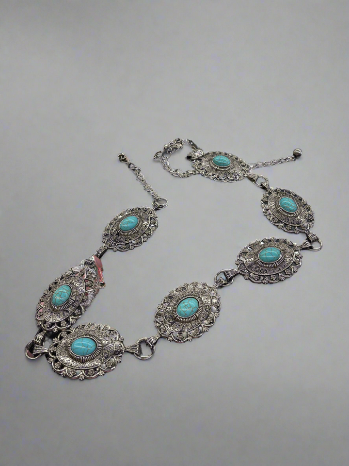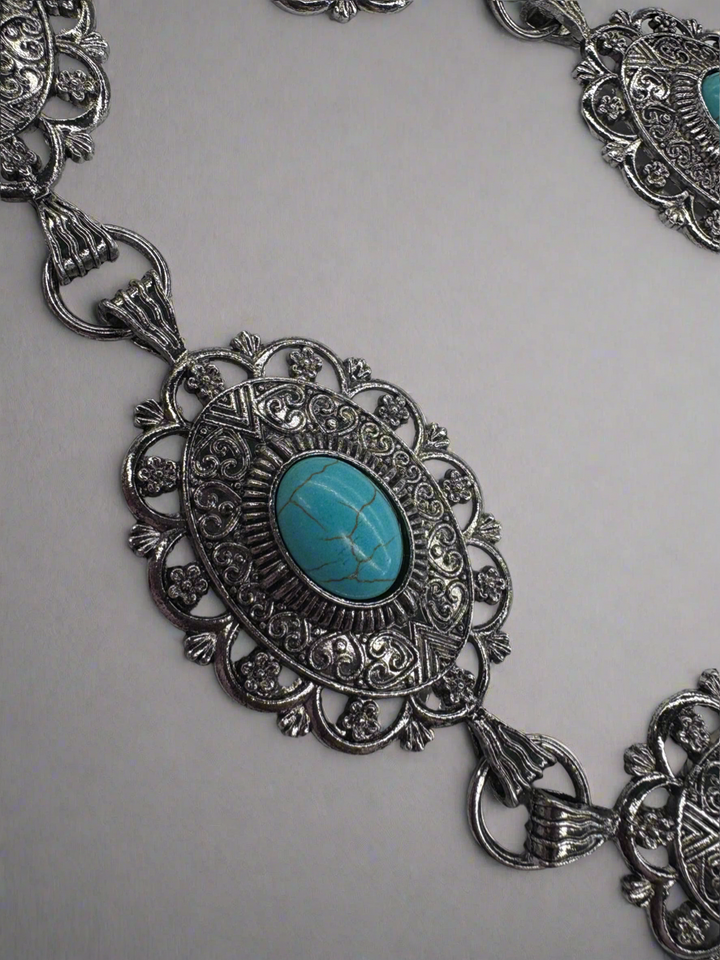 Enhance any outfit with our Western Turquoise Stud Women’s Chain Belt. This oval silver chain belt features beautiful turquoise studs, adding a touch of western and casual flair. Versatile and stylish, it's a must-have accessory for any wardrobe. Adds a touch of western charm to your Western outfit. Featuring a stunning turquoise stud, this belt is the perfect accessory to tie together.